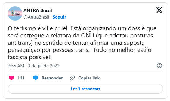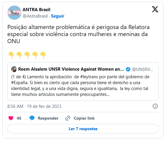 “Logo após cancelar a visita oficial de Reem Alsalem, o Ministério é visto assumindo uma posição ideológica pública sobre o assunto, convidando a Associação Nacional de Travestis e Transexuais (ANTRA) a ocupar um lugar na mesa de decisão. Ao mesmo tempo que se recusa a definir o que é uma mulher e se recusa a dialogar com as mulheres, o Ministério homenageia e dialoga com uma Associação que falsifica dados, espalha notícias falsas, engana as mulheres e, mais importante, cujos membros não são mulheres. O Brasil tem uma relação oficial com a ONU, portanto, a ONU deveria investigar minuciosamente por que o Ministério das Mulheres brasileiro se recusou a receber uma de suas representantes. A ONU não deveria deixar isso passar.”