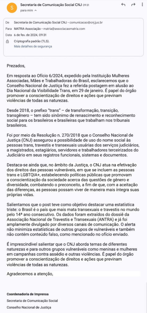 Informamos que seguiremos entrando em contato tanto com o CNJ quanto com demais órgãos públicos e de imprensa para que retifiquem ou retirem do ar afirmações falsas que não apenas não são benéficas para a população autodeclarada trans, como são prejudiciais a outras parcelas da população, como meninas e mulheres.