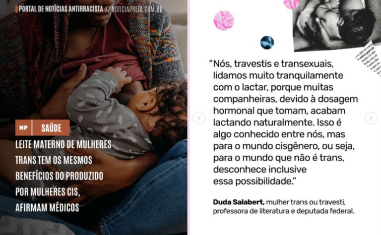Em 27 de fevereiro os canais de comunicação O Joio e O trigo (@ojoioeotrigo) e Notícia Preta (@noticia.preta) noticiaram que “mulheres trans” (homens biológicos) poderiam amamentar um bebê: Nos causa estranhamento que esse assunto apareça simultaneamente em mais de um…
