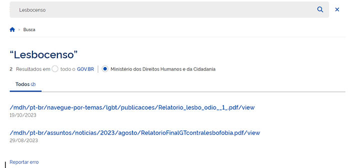 - Em que pese a menção ao Relatório Descritivo da 1a Etapa do I Lesbocenso Nacional: Mapeamento de Vivências Lésbicas no Brasil, que não foi posto em questão pela MATRIA, encontramos apenas duas menções ao mesmo no site do MDHC e uma no google, enquanto a propagação das falsas afirmações feitas nos Dossiês da ANTRA é constante, no site, em redes sociais e nos discursos dos integrantes do Ministério dos Direitos Humanos e da Cidadania.