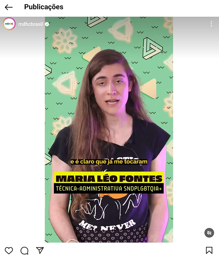 No entanto, o vídeo do MDHC identifica com nome e função ocupada no Ministério a pessoa do sexo masculino que aparece em seu vídeo dizendo frases como “sou mulher e é claro que já me tocaram sem o meu consentimento” e “empoderar mulheres é uma revolução”: