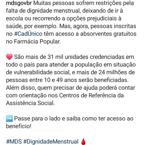 Em 24/01/2024, o Ministério do Desenvolvimento e Assistência Social, na esteira de outros ministérios, divulgou campanha sobre dignidade menstrual e distribuição gratuita de absorventes nas farmácias populares.