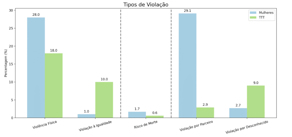 Os dados do Disque 180 comprovam as naturezas diferentes das violências que atingem mulheres e TTTs. As mulheres ligam para reportar violência física com quase o dobro da frequência (28% das ligações) do que as pessoas TTT (18%). TTTs, por sua vez, reportam mais violação à igualdade (10% das ligações de TTTs contra apenas 1% das ligações das mulheres).