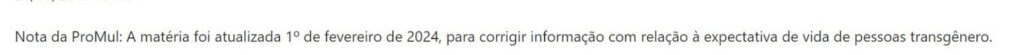 No dia 01 de fevereiro o site do Senado retificou a reportagem com informação equivocada sobre expectativa de vida de transexuais, depois da MATRIA protocolar ofício na Ouvidoria da Procuradoria Especial da Mulher, no dia 12/01.