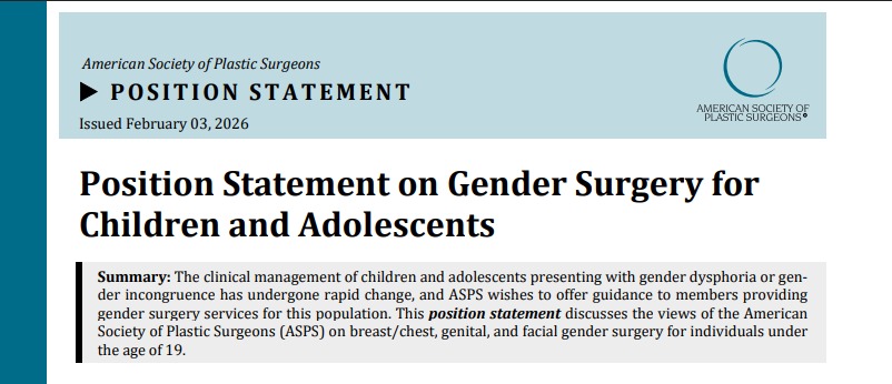 Em consonância com a declaração da ASPS de agosto de 2024 de que a base geral de evidências para intervenções endócrinas e cirúrgicas relacionadas ao gênero apresenta baixa certeza, e à luz de publicações recentes que relatam evidências de muito baixa ou baixa certeza quanto aos desfechos de saúde mental, juntamente com preocupações emergentes sobre possíveis danos de longo prazo e a natureza irreversível das intervenções cirúrgicas em uma população em situação de vulnerabilidade do ponto de vista do desenvolvimento, a ASPS conclui que há evidência insuficiente que demonstre uma relação favorável entre riscos e benefícios para o percurso de intervenções endócrinas e cirúrgicas relacionadas ao gênero em crianças e adolescentes. A ASPS recomenda que cirurgiões adiem cirurgias de mama ou tórax, genitais e faciais relacionadas ao gênero até que o paciente tenha pelo menos 19 anos de idade.