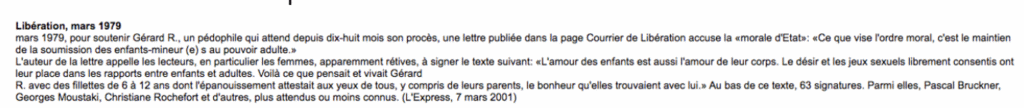 Em 1979, a Libération publicou outra petição, em apoio a um homem que estava a ser julgado por crimes sexuais contra meninas dos seis aos doze anos, também assinada por uma série de intelectuais públicos.