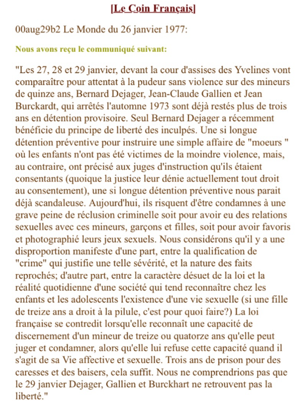 Uma carta aberta foi publicada no jornal francês Le Monde em 1977, na véspera do processo contra três cidadãos franceses, DeJager Bernard, Jean Claude-Jean e Gallien Burckhardt, todos acusados de ter tido relações sexuais com meninos e meninas entre 13 e 14 anos. Os signatários incluíram Jean-Paul Sartre, Simone de Beauvoir, Gilles Deleuze, Roland Barthes e Louis Aragon.
