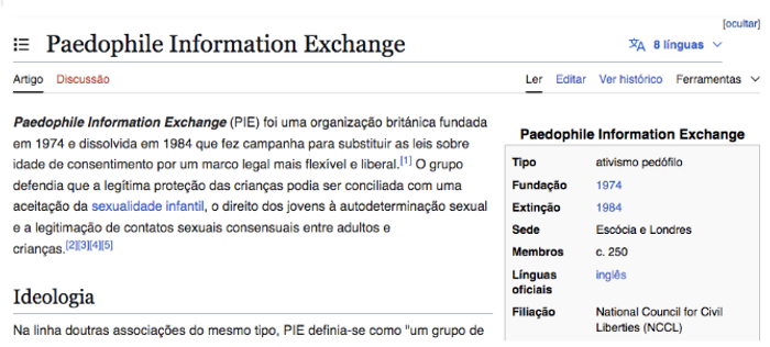 Embora as defesas completas do abuso sexual infantil como “bom” para as crianças sejam menos comuns nas últimas décadas, elas ainda estão em vigor. Tom O’Carroll, do PIE, é um homem que ainda os escreve com determinação em revistas acadêmicas como Sexuality and Culture. Nesta revista e na Archives of Sexual Behavior, ocorre uma batalha de ideias entre os proponentes do abuso sexual infantil e os homens que entendem a prática como abusiva. O artigo de O’Carroll de 2018 é intitulado “A ‘inocência’ da infância não é ideal”. Ele usa vários filósofos históricos do sexo masculino para argumentar a razoabilidade ética do que ele chama de sexo “criança-adulto”. Os exemplos da vida real que ele usa para defender sua posição, no entanto, são surpreendentes. Uma delas é comparar homens adultos que usam crianças sexualmente com o uso sexual de animais: … a afirmação de que as crianças são incapazes de relações sexuais recíprocas é empiricamente infundada. Onde está a evidência? Uma comparação com animais é novamente sugerida (O’Carroll, 2018: 1237).