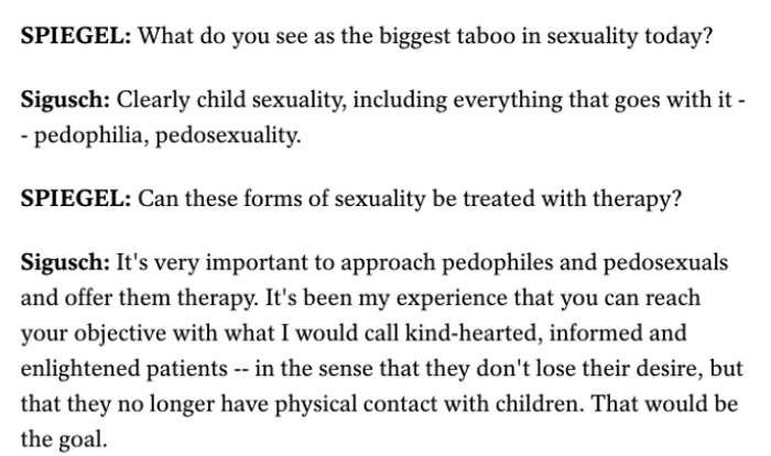 O sexólogo Volkmar Sigusch que criou o termo “cis” também afirmou que “não há nada de errado com a pedofilia”. Em 2010, Sigusch publicou “Teses de Sexologia Sobre o Debate Sobre o Abuso” onde ele disse: