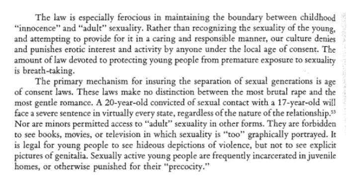 “A lei é especialmente feroz na manutenção da fronteira entre a ‘inocência‘ infantil e a sexualidade ‘adulta‘. Em vez de reconhecer a sexualidade dos jovens e tentar fornecê-la de uma forma carinhosa e responsável, a nossa cultura nega e pune o interesse e a atividade erótica de qualquer pessoa abaixo da idade local de consentimento. A quantidade de leis dedicadas à proteção dos jovens da exposição prematura à sexualidade é impressionante.