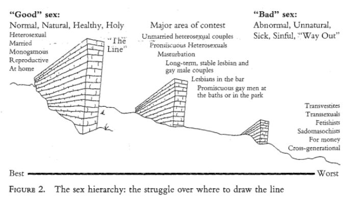 Tradução: “A Figura 2 ilustra outro aspecto da hierarquia sexual: a necessidade de traçar e manter uma linha imaginária entre o sexo bom e o sexo ruim. A maioria dos discursos sobre sexo, sejam eles religiosos, psiquiátricos, populares ou políticos, delimitam uma parcela muito pequena da capacidade sexual humana como santificável, segura, saudável, madura, legal ou politicamente correta. A ‘linha‘ distingue estes de todos os outros comportamentos eróticos, que são entendidos como obra do diabo, perigosos, psicopatológicos, infantis ou politicamente repreensíveis. Os argumentos são então conduzidos sobre ‘onde traçar o limite‘ e para determinar quais outras atividades, se houver, podem ser permitidas passar para a aceitabilidade.” [6]