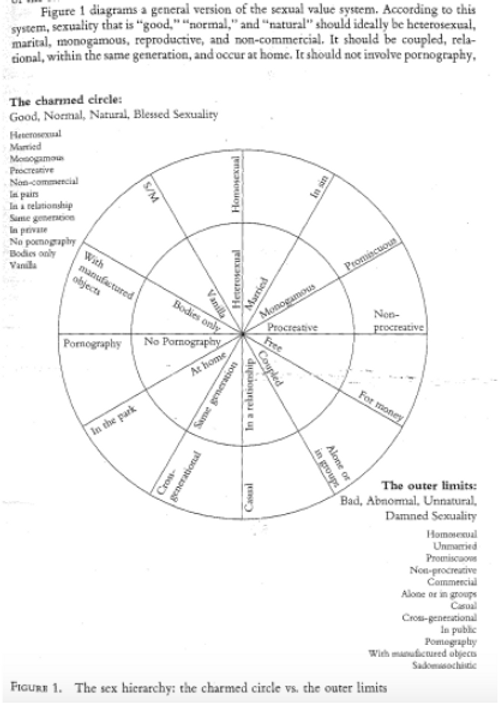 Tradução: “A Figura 1 representa uma versão geral do sistema de valores sexuais. De acordo com este sistema, a sexualidade ‘boa‘, ‘normal‘ e ‘natural‘ deveria idealmente ser heterossexual, conjugal, monogâmica, reprodutiva e não comercial. Deve ser acoplado, relacional, dentro da mesma geração e ocorrer em casa. Não deve envolver pornografia, objetos fetichistas, brinquedos sexuais de qualquer tipo ou papéis que não sejam masculinos e femininos. Qualquer sexo que viole essas regras é ‘ruim‘, ‘anormal‘ ou ‘não natural‘. O sexo ruim pode ser homossexual, solteiro, promíscuo, não procriativo ou comercial. Pode ser masturbatório ou ocorrer em orgias, pode ser casual, pode cruzar gerações e pode ocorrer em ‘público‘, ou pelo menos nos arbustos ou nos banhos. Pode envolver o uso de pornografia, objetos fetichistas, brinquedos sexuais ou papéis incomuns (ver Figura 1)” [5]