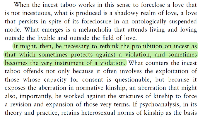 Butler está argumentando que às vezes o incesto entre pais e filhos não é uma violação. Ela também escreveu:
