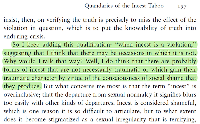 “Então, continuo adicionando esta qualificação: ‘quando o incesto é uma violação’, sugerindo que pode haver ocasiões em que não o é. Por que eu falaria assim? Bem, eu penso que provavelmente existem formas de incesto que não são necessariamente traumáticas ou que ganham seu caráter traumático em virtude da consciência de vergonha social que produzem.” [3]