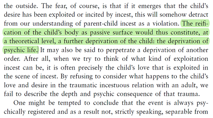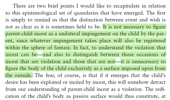 “Não é necessário imaginar o incesto entre pais e filhos como uma invasão unilateral do pai sobre a criança, uma vez que qualquer invasão que ocorrer também será registrada na esfera da fantasia. Na verdade, para compreender a violação que o incesto pode ser – e também para distinguir entre as ocasiões de incesto que são uma violação e as que não são – é desnecessário figurar o corpo da criança exclusivamente como uma superfície imposta a partir de fora.” [1]