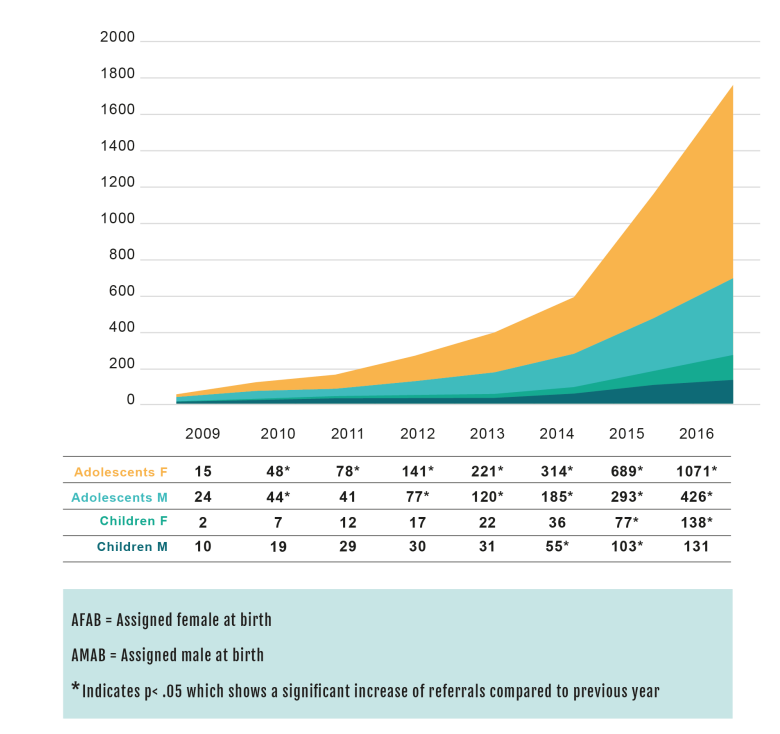 17. O número de crianças e jovens que se apresentam ao Serviço de Identidade de Gênero (GIDS) do NHS do Reino Unido tem aumentado ano após ano desde 2009, com um aumento exponencial em 2014.